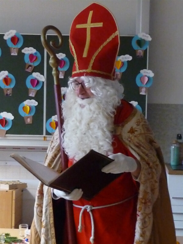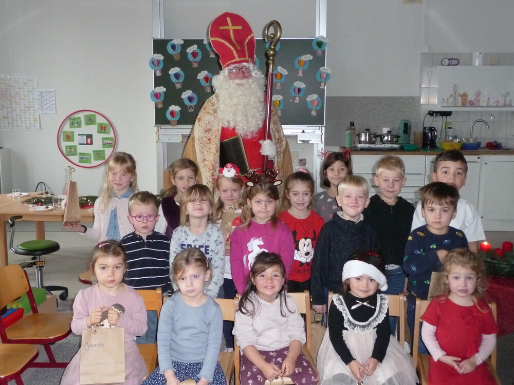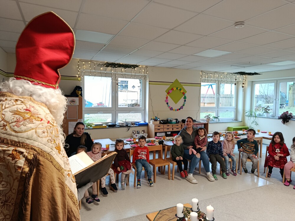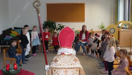"Hurra, hurra, der Nikolaus ist wieder da!" , alle Kinderaugen strahlten als uns am Freitag der Nikolaus besuchte. Er erzählte uns die Legende von den drei Säcken und brachte auch sein goldenes Buch mit, in dem so manches über uns geschrieben stand. Jedes Kind durfte den Stab des Hl. Nikolaus halten, wir sangen unsere Nikolaus- und Adventslieder vor. Am Ende hatte der Nikolaus unsere Nikolaussäckchen dabei, die mit Leckereien gefüllt waren. Wir freuen uns schon auf das nächste Jahr.