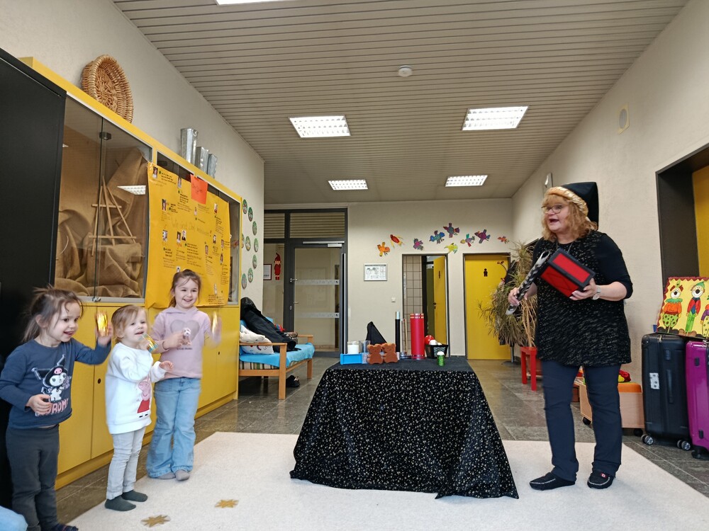 "Abrakadabra, simsalabim, so spricht der Zauberer Isegrimm", so verzauberten unsere zwei Zauberer die Kindergartenkinder in Drachen, Hexen, Gespenster, Feen, Einhörner und Zwerge. Dem Jahresmotto "Auf dem Zauberteppich ins Land der Fantasie" folgend, flogen, galoppierten, schwebten , geisterten die Wesen aus der Traumwelt bei der kleinen Aufführung für die begeisterten Gäste über die Schulwiese.