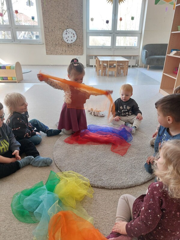 Mit bunten Tüchern haben wir den Frühling aufgeweckt und den Ostertanz getanzt.