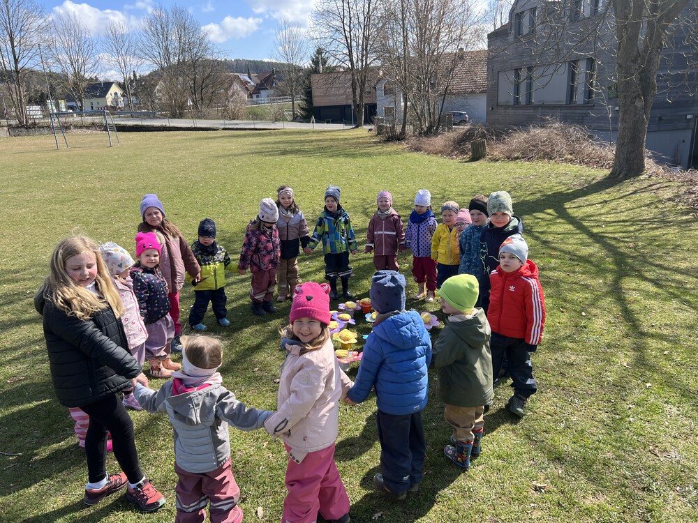 Am letzen Kindergartentag gehen wir auf die Suche nach unseren Nestern, die wir natürlich alle , gefüllt vom Osterhasen, finden.